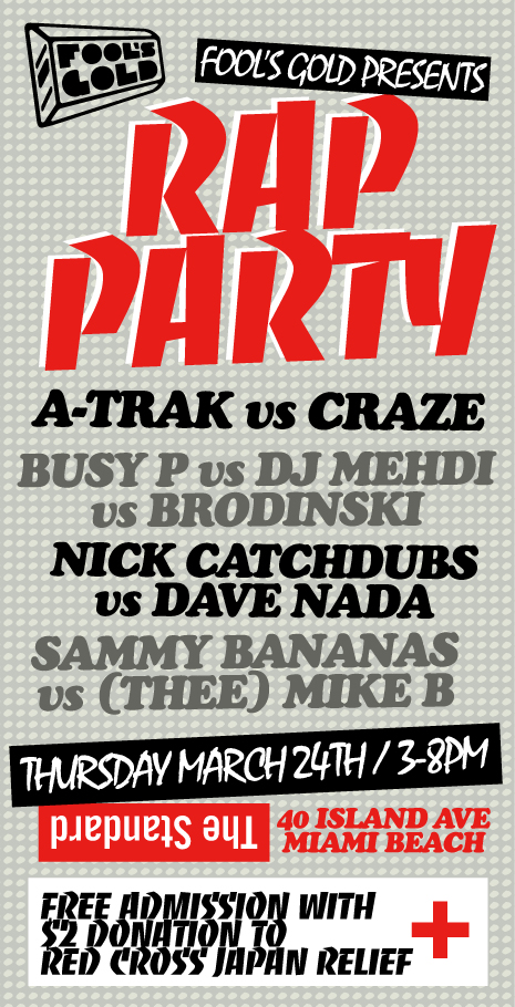 RAP PARTY is just what you’d expect from the name: an afternoon of rap jams spun b2b from A-Trak and Craze, Busy P, Mehdi and Brodinski, Nick Catchdubs and Dave Nada, and Sammy Bananas and (Thee) Mike B. It goes down from 3-8pm at The Standard and is free with a donation to the Red Cross’ Japan relief efforts. We’ll see you there!